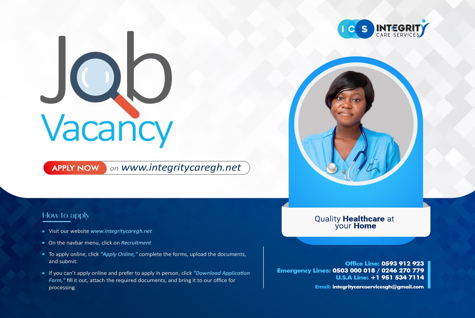 Integrity Care Services (ICS) is an established limited liability Home health care company located in Kumasi (Kwadaso North). The company was incorporated on March 8, 2018, under the Companies Act, 1963 (Act 179) in Ghana. The establishment of this home care company has become necessary because of the growing need for home health care services for the senior population and loved ones with various challenging healthcare needs in the country. We are regulated under the Health Facility Regulatory Agency (HeFRA).
